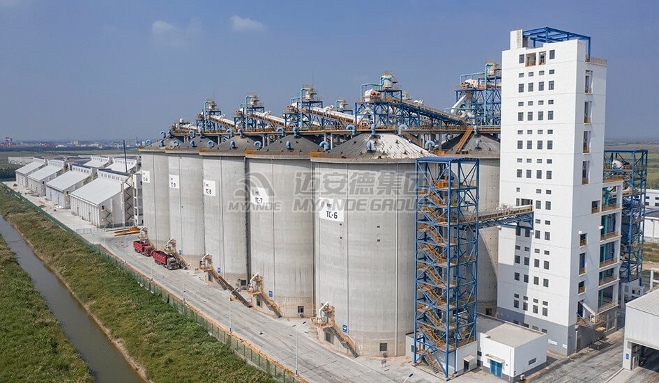 邁安德原糧筒倉捷運系統(tǒng)由投糧系統(tǒng)、清理系統(tǒng)、進倉系統(tǒng)、出倉系統(tǒng)、通風、鼓冷、熏蒸系統(tǒng)、糧情檢測系統(tǒng)、除塵系統(tǒng)等系統(tǒng)組成。卡車將原糧轉運至廠區(qū)并傾倒于投料坑中,原糧通過變頻刮板、提升機均勻地輸送至倉頂,再通過倉頂?shù)妮斔驮O備(刮板輸送機、皮帶輸送機)分配進倉。
